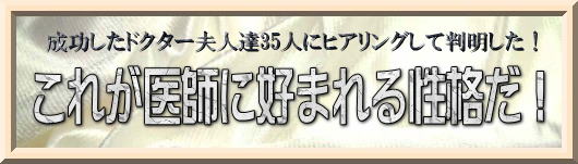 「これが医師に好まれる性格だ!」をご覧になった人は、「え?お医者さんには、こんな性格が好まれるの?」と、成功したドクター夫人達が相手の先生に好まれた性格や内面性を知って、驚かれる事でしょう。