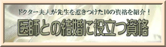 以上の条件をクリアし、成功したドクター夫人達が取得していて医師との結婚で相手の先生に影響を与えた資格を掲載しています。医師との結婚で役立つ資格の情報としては、唯一の「医師との結婚に役立つ資格」。ぜひ積極的に活用してください。