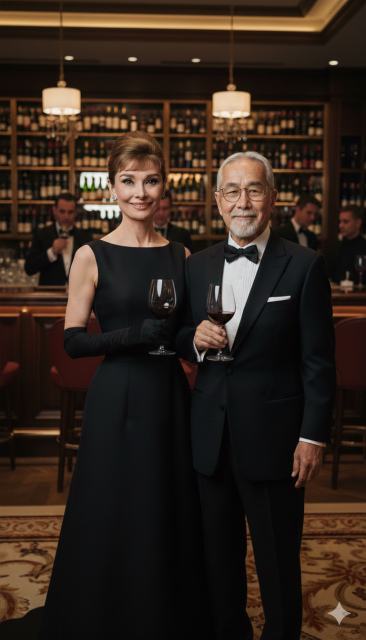 背景をワインバーに変えて、パートナーをオードリー・ヘップバーンに。