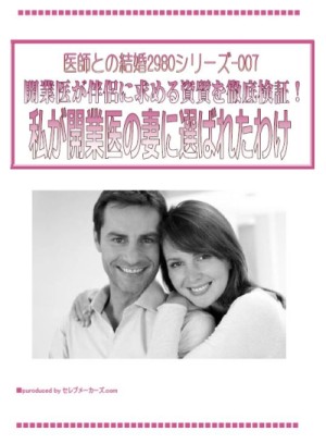 「私が開業医の妻に選ばれたわけ」は、セレブメーカーズ.comがサポート・アシストして全くのゼロから開業医と結婚したドクター夫人10人が、相手の先生から彼女達のどこが気に入られ伴侶に望まれたのかを明らかにする目的で作成しました。開業医は伴侶のどういう資質を望むのか?これが明らかになれば女性側のアピールをどう工夫すればよいかが見えてきます。実際、10人のドクター夫人を検証してみて、開業医が好む女性には一定の共通項がある事が判明しました。また彼女達が行ったアピールにも、共通した傾向が見られます。こうした実証的データに基づいた「私が開業医の妻に選ばれたわけ」を活用して皆さんのドクター婚活を成功させ、精神的・物理的に恵まれた末長い幸福な人生を手に入れてください。