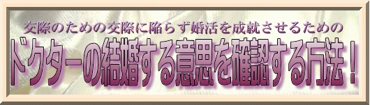 交際に失敗した人達の貴重な教訓を生かし、ドクター婚活成就を実現させるためにも、絶対に「ドクターの結婚する意思を確認する方法!」を手元においてください!