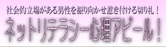 社会的立場がある男性を振り向かせ惹き付ける切り札!「ネットリテラシー心理アピール!」はインターネット利用のための理解力や活用力であるネットリテラシーが欠如した男性に対し、その事実を強く指摘しながら同時に女性の魅力を高い訴求力で伝えるための激レア情報です。