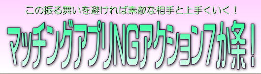 そこで「ハッピーマッチングサポート」では、これさえやらなければ素敵な相手と出会えるという、マッチングアプリにおけるNG行為を洗い出しました。同時にNG行為を防ぐための対策も開発。せっかくマッチングした素敵な相手との真剣な出会いを実現するための情報として構成したのが「マッチングアプリNGアクション7か条!」です!